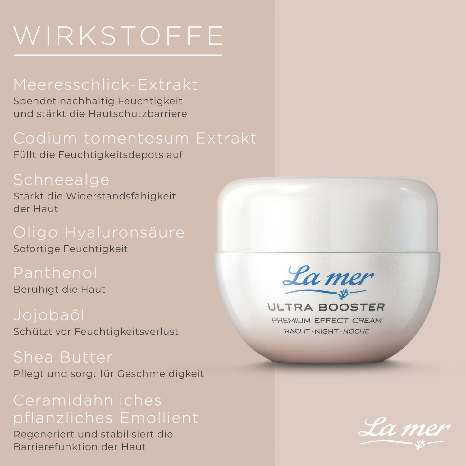 La mer ist eine deutsche Hautpflegemarke mit über 40 Jahren Tradition, die besonders verträgliche, exklusive Pflegeprodukte „Made in Germany“ entwickelt. Die Formulierungen basieren auf dem mineral‑ und sauerstoffreichen Meeresschlick‑Extrakt aus dem Wattenmeer, ergänzt durch hochwertige natürliche Wirkstoffe und dermatologisch getestete Rezepturen. La mer legt großen Wert auf Nachhaltigkeit, Umwelt‑ und Ressourcenschutz, produziert am Standort Cuxhaven und verfolgt eine saubere, umweltbewusste Kosmetikphilosophie.